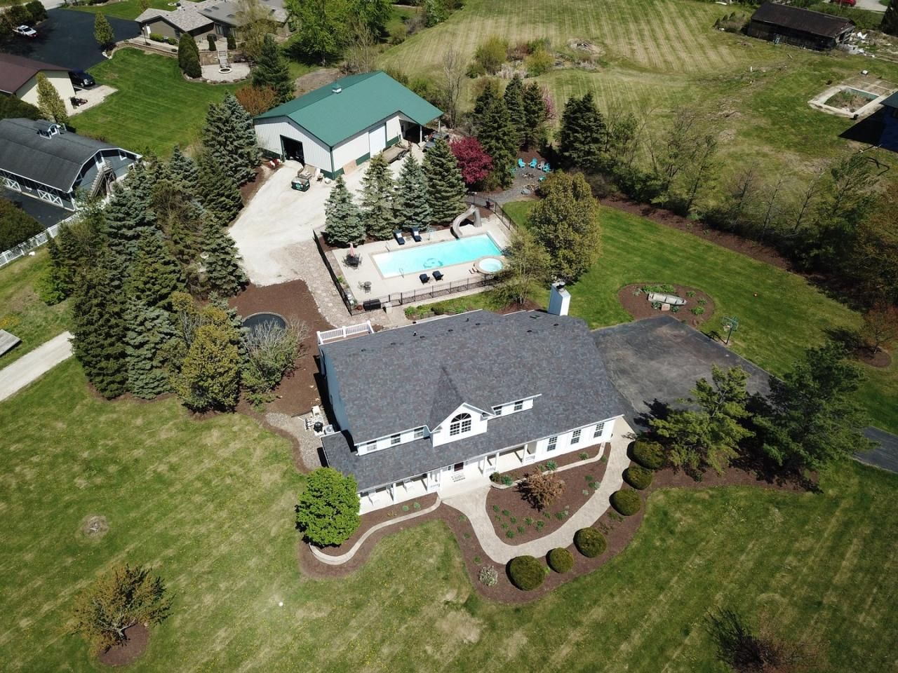 Nestled on 3 acres of land, this stunning property has everything you could want and more. With over 3,000 square feet of living space, this home is perfect for those who love to entertain or enjoy a private oasis. Additionally, the property boasts a 42 x 60 Morton Outbuilding that is insulated and heated with concrete floors, and its own driveway which is a rare find! The kitchen is a chef's dream, recently remodeled with gorgeous Quartzite countertops and top-of-the-line Jenn Air appliances, including a massive kitchen island with seating on two sides. The master bath has also been tastefully remodeled to provide a luxurious and relaxing space with a door to an upper level private deck that is built and wired for a hot tub and offers amazing views! The finished basement is perfect for entertaining guests or for use as a private retreat, with a wet bar that includes a built-in mini fridge, a rec/TV/gaming area, workout space, a flex room currently used as a bedroom, and a half bath. Step outside to your backyard oasis, designed for outdoor entertaining or personal relaxation. The stunning built-in heated Sunco San Juan fiberglass pool (16' x 44') and hot tub with slide and basketball hoop provide the ultimate in relaxation and recreation. The amazing stone outdoor kitchen features a built-in fire table, perfect for grilling and dining al fresco. The awesome firepit area gives you the feeling of being in the North Woods! Best of all with this property, there's no HOA! Don't miss out on this incredible property - make your move today and schedule a viewing.