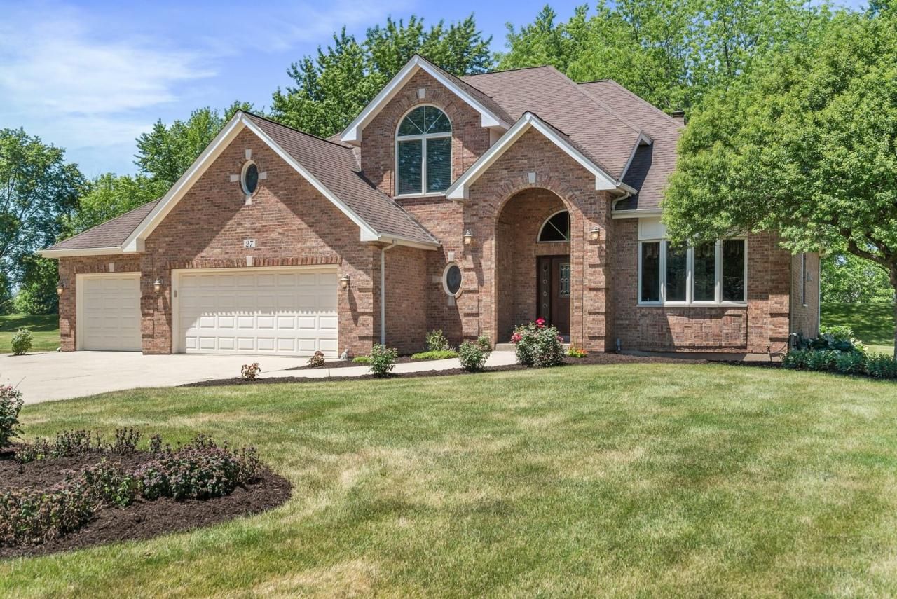 CUSTOM BUILT ALL BRICK home on over an acre has been very well maintained and is located in a cu-de-sac. Walk in to a 2-story entrance with 2 coat closets. French doors take you into the den/office with a bay window. The entire first floor has 10' ceilings making every room seem grand. The formal dining room has beautiful hardwood floors. The kitchen has an abundance of 42 cabinets with many pull out shelves, 2 pantry cabinets, desk space and large island allowing for expansive preparing and serving space. The breakfast area walks out to the deck and shares a 2-sided stone fireplace with the family room. The open concept kitchen and family room are ideal for everyday living and entertaining. The master is located on the main floor and showcases new carpeting. A private door to the deck is inviting for morning coffee or that winding down glass of wine. The private bathroom includes a separate shower and jet tub, double sinks, and a 12x8 walk in closet. A second-floor nook/loft is surrounded by the additional bedrooms. Bedroom 2 has a private bathroom with a shower. Bedrooms 3 and 4 are a Jack and Jill configuration. The shared bathroom's function is perfect as the double sinks are in a separate room from the tub/shower combination and toilet, conveniently keeping the mornings moving. More living space is transformed in the partially finished basement allowing for a 5th bedroom. The Media room features the homes second wood burning fireplace. By the way, the reclining chairs can stay. The recreation room has an adorable playhouse. An expansive storage/work room rounds out this basement. The 3 car plus garage has a 13x7 workspace, storage shelving, and a service door. Manicured landscape surrounds the home including the concrete patio and maintenance free deck.